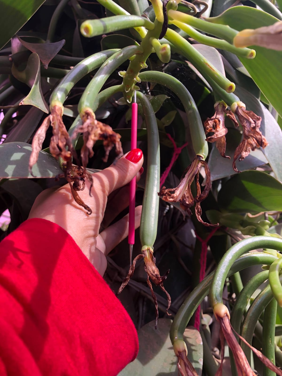 A polinização das nossas orquídeas é feita manualmente, uma a uma, assim como a colheita das favas, depois de maturadas.
